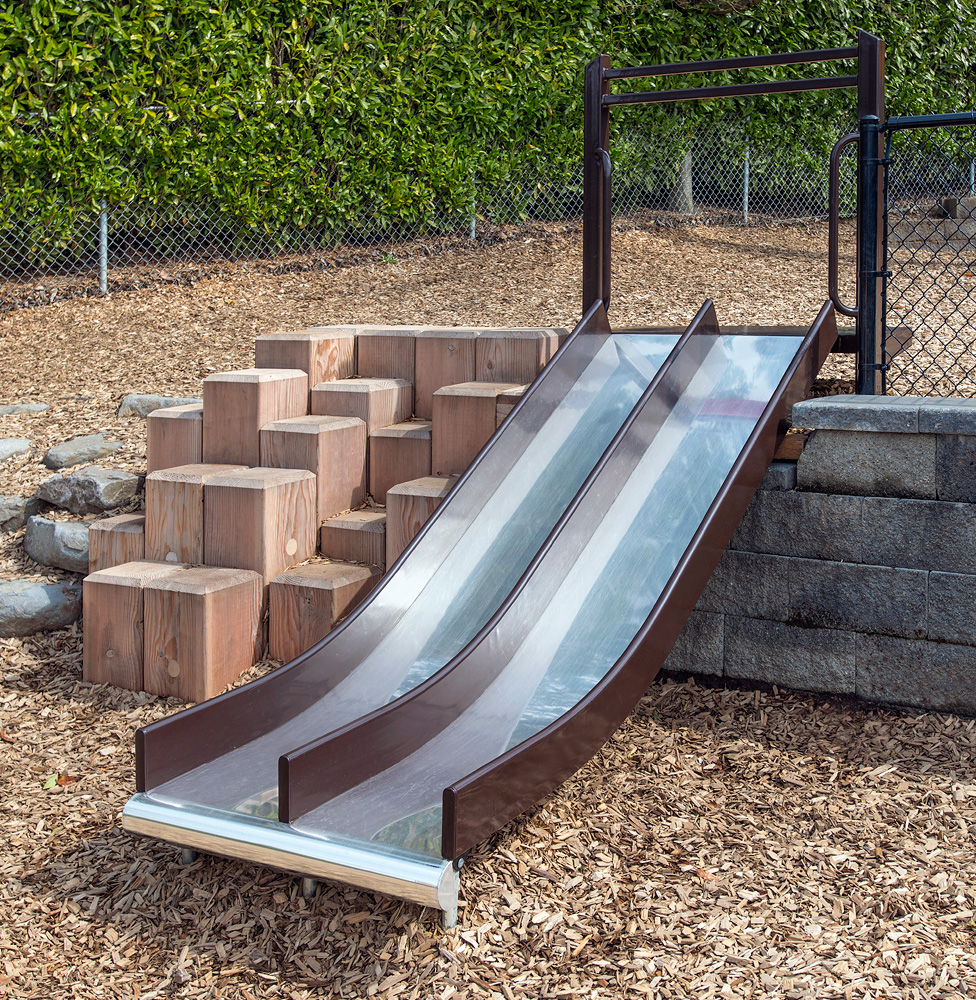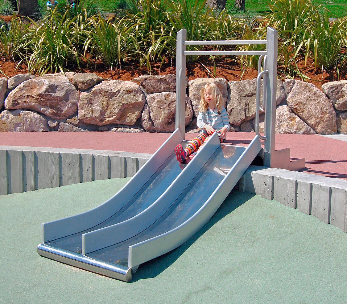 1643-262-EMB Wide Embankment Chute with Center Rail Stainless Steel with 6" (15cm) Tall Side & Center Rails For 26' Drop in Elevation Features/Activities: Stainless Steel chute is 36" wide with 6" tall powder-coated Side and Center Rails. Bed is seamless 16-gauge bright annealed stainless steel. Also offered as a WAVE Slide - contact us for more information. Accessibility Profile: Entry platform is flush with grade (standard) or elevated (ADA accessible) as shown. Downloads: View or Download: |
