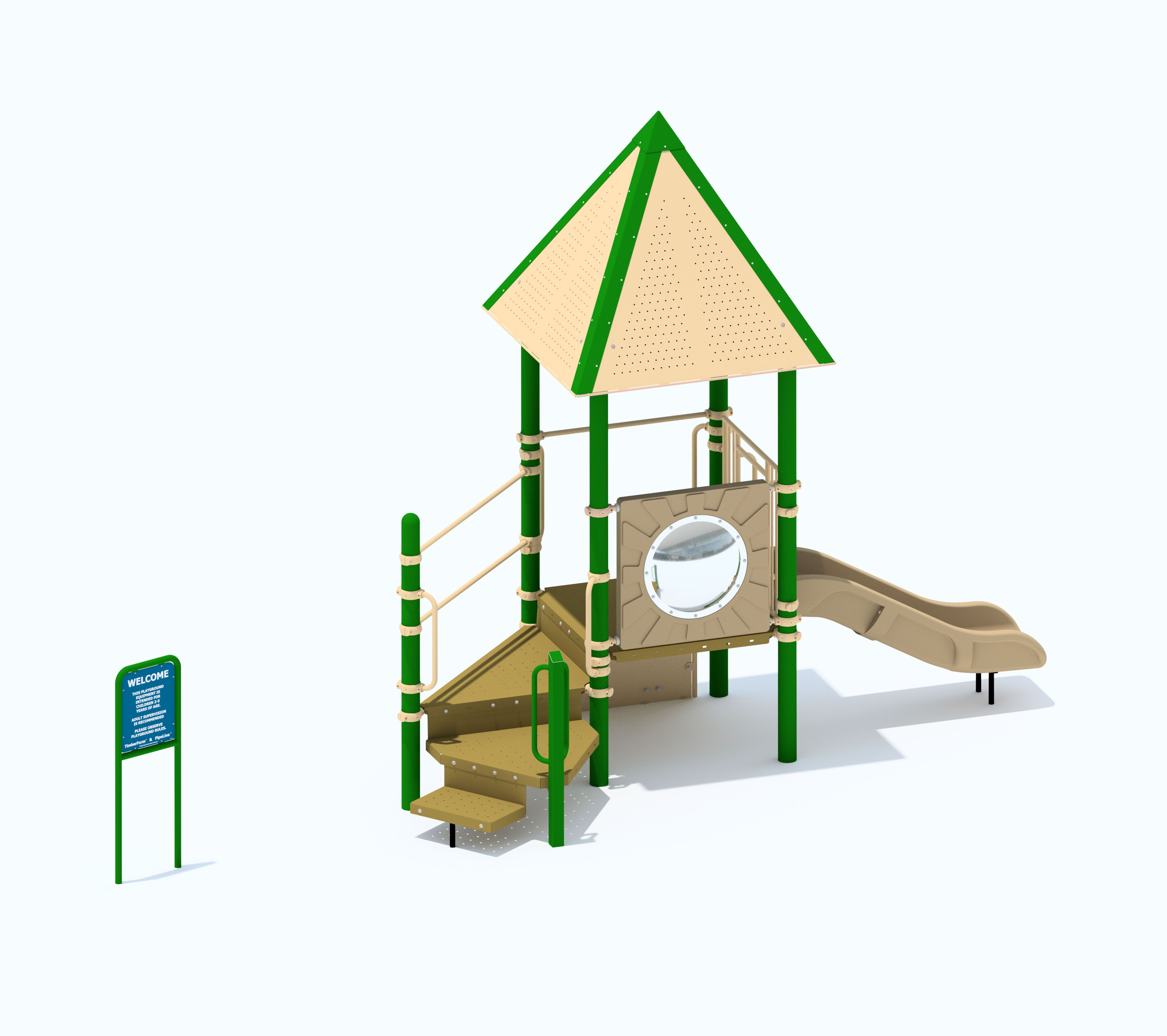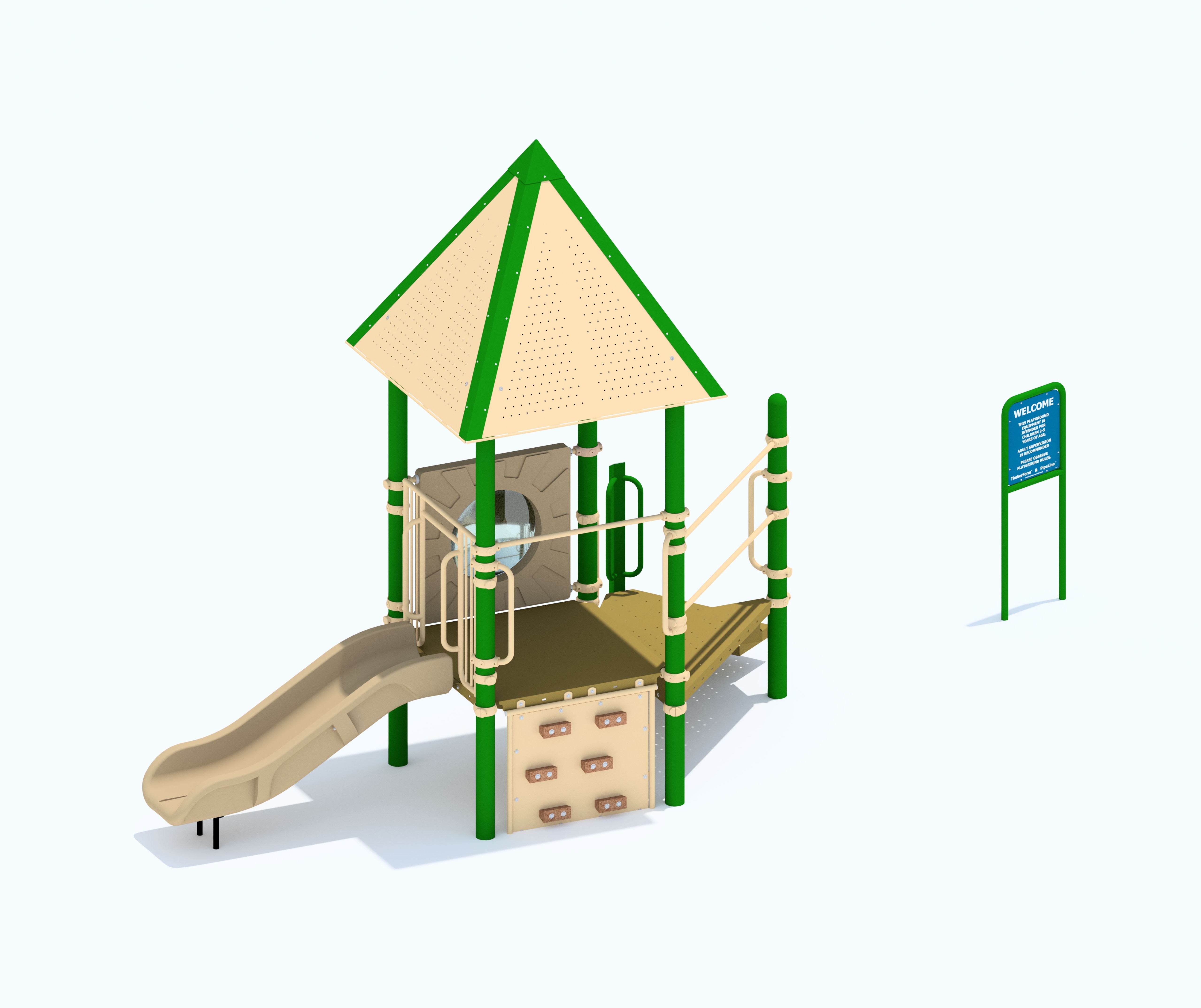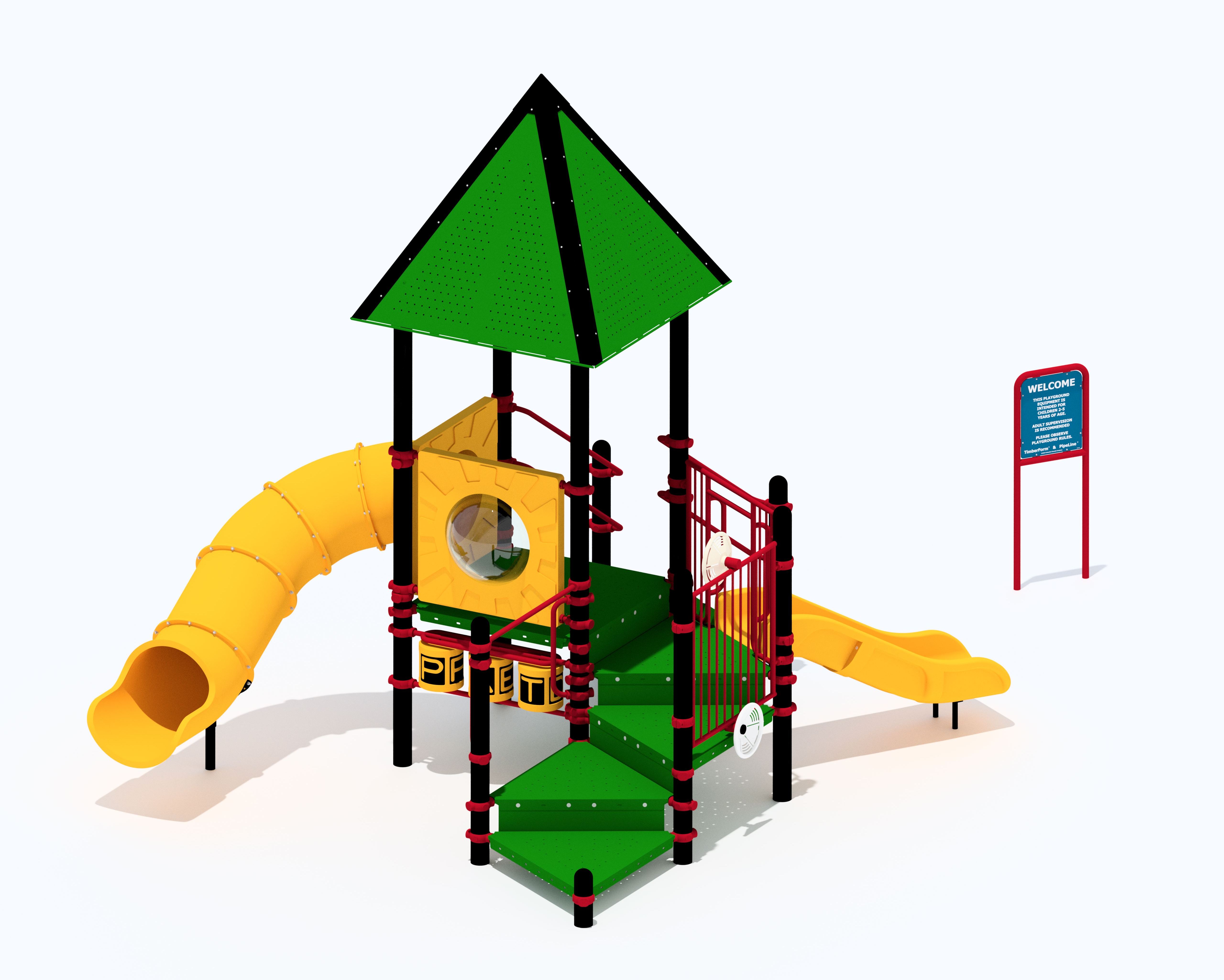 PipeLine 9804 Features/Activities: Play Area, Equipment Only: 15' x 17' (4.6m x 5.2m) Minimum Safe Use Zone: 27' x 29' (8.3m x 8.9m) 9804 Features: Accessible Entrance Deck, Baluster Wall with Two Ship's Wheels, Bubble Panel, Grade Climber, Steel with Handrails, Perforated Steel Roof, Spelling Panel, Tot Slide Chute, Curved, Tube Chute, Curved, Welcome/Rules Sign Colors Illustrated: Posts: Black Accessories: Black, Evergreen & Red Decks: Perforated Steel, Evergreen Plastic: Yellow Accessibility Profile: 7 Total Play Components 5 Elevated Play Components (5 Accessible) 2 Ground Level Play Components (2 Accessible) Downloads: View or Download: PipeLine 9808 Features/Activities: Play Area, Equipment Only: 13' x 10' (4.0m x 3.1m) Minimum Safe Use Zone: 25' x 22' (7.7m x 6.8m) 9808 Features: Accessible Transfer Station with 8" (21cm) Riser, Block Climber, Convex/Flat Mirror Panel, Roof, Tot Slide Chute, Curved, Welcome/Rules Sign Colors Illustrated: Posts: Evergreen Accessories: Coffee Tan Decks: SofDek Plastic-coated Perforated Steel, Brown Plastic: Tan Accessibility Profile: Accessibility Profile: 4 Total Play Components 3 Elevated Play Components (3 Accessible) 1 Ground Level Play Components (1 Accessible) Downloads: View or Download: |