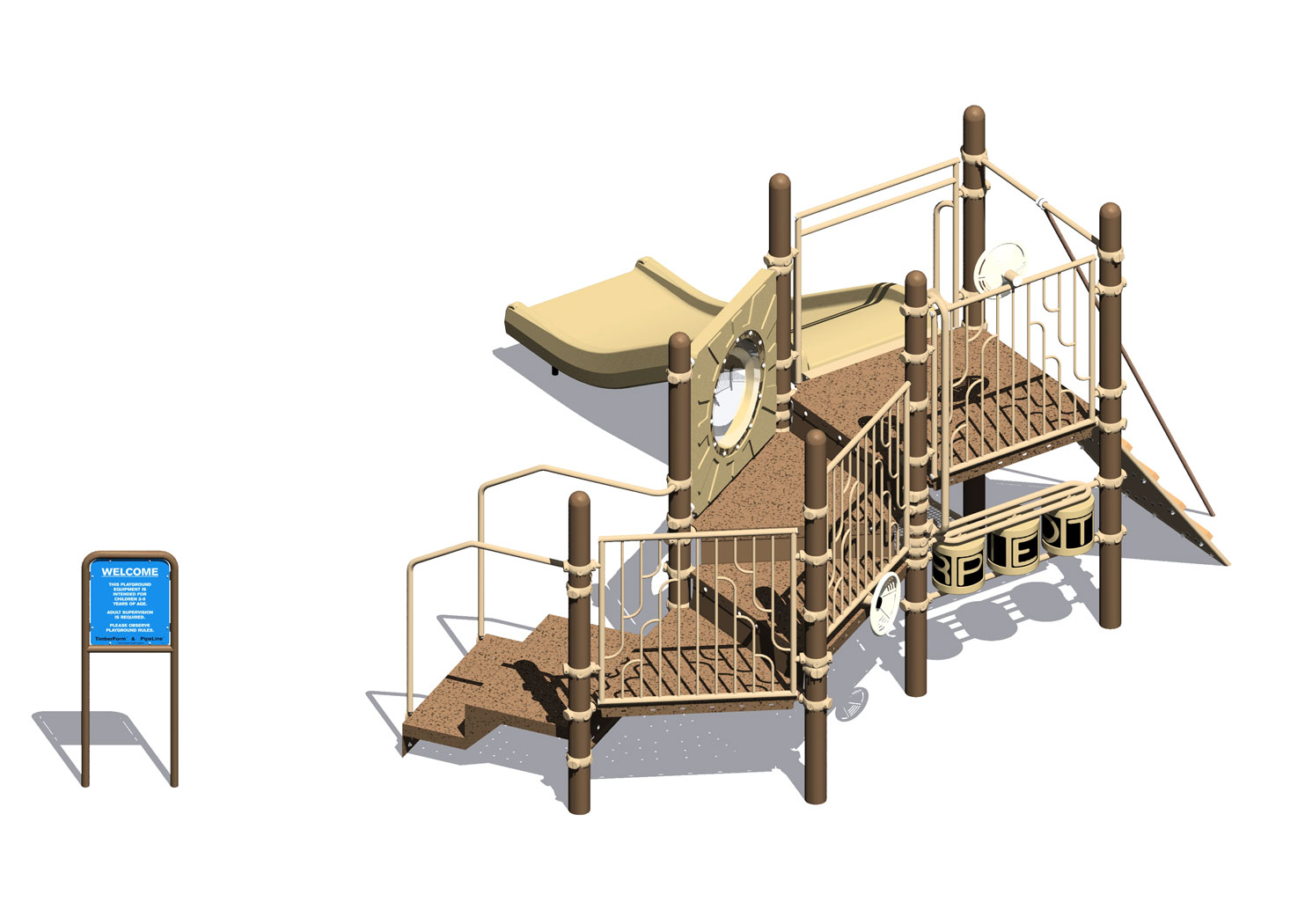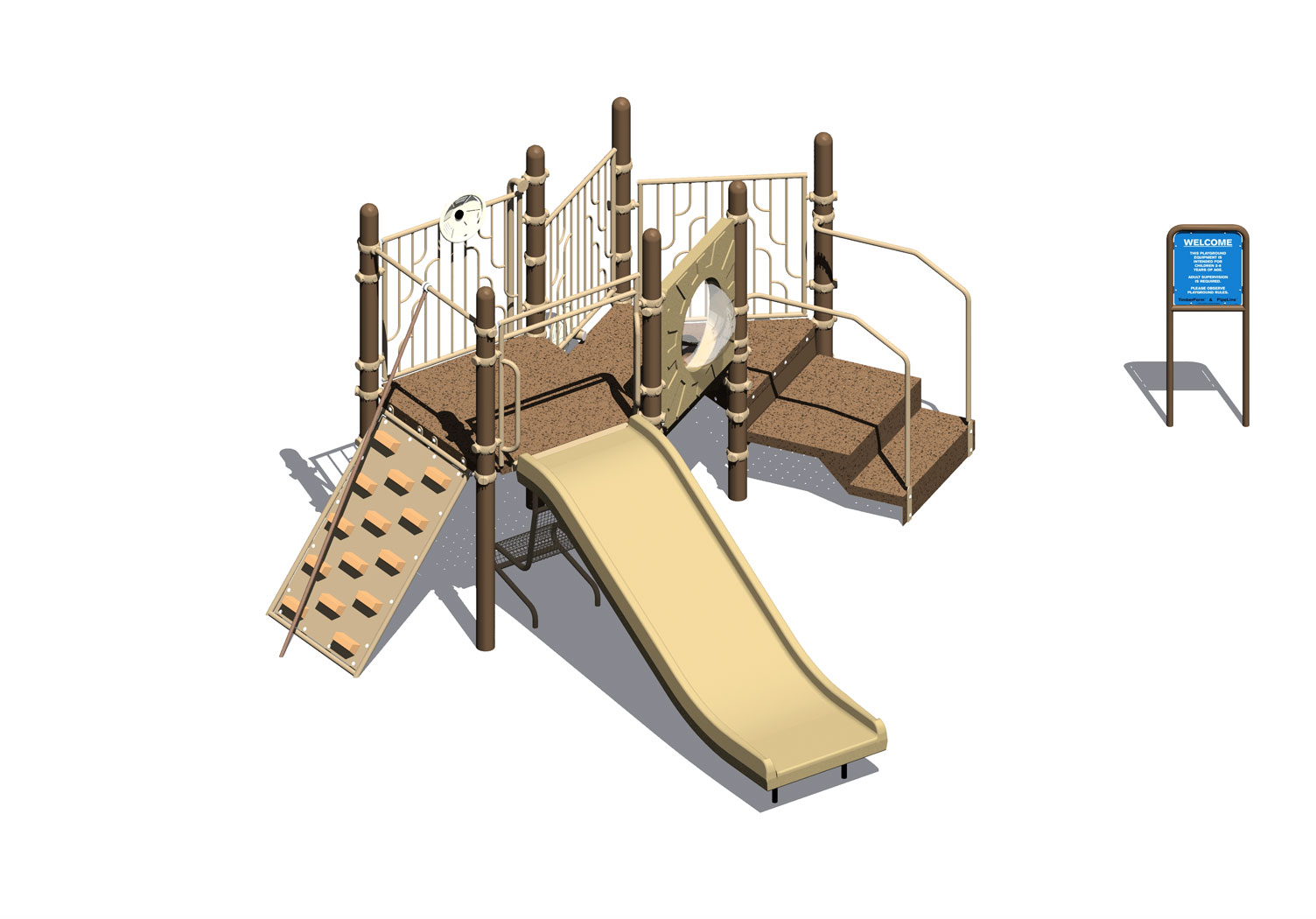 PipeLine 9826 Features/Activities: Play Area, Equipment Only: 16' x 16' (4.9m x 4.9m) Minimum Safe Use Zone: 28' x 28' (8.6m x 8.6m) 9826 Features: Accessible Transfer Station with 8" (21cm) Riser, Bubble Panel, Climbing Ramp, Decorative Wall, Decorative Wall with Ship's Wheel (2), Kid's Bench, Spelling Panel, Talk Tube, Welcome/Rules Sign, Wide Chute Colors Illustrated: Posts: Brown Accessories: Coffee Tan Decks: SofDek Plastic-coated Perforated Steel, Brown Plastic: Tan Accessibility Profile: 8 Total Play Components 5 Elevated Play Components (5 Accessible) 3 Ground Level Play Components (3 Accessible) Downloads: View or Download: PipeLine 9834 Features/Activities: Play Area, Equipment Only: 20' x 15' (6.1m x 4.6m) Minimum Safe Use Zone: 32' x 27' (9.8m x 8.3m) Play Area, Spring Rider Only: 3' x 2' (1.0m x 0.7m) Minimum Safe Use Zone: 15' x 14' (4.6m x 4.3m) 9834 Features: Accessible Entrance Deck, Accessible Spring Rider, Addition Panel, Baluster Wall with Ship's Wheel, Bubble Panel, Coil Climber, Kid's Bench, Spelling Panel, Tic-Tac-Toe, Curved Tot Slide Chute, Welcome/Rules Sign, Stainless Steel Wide Chute with Center Rail and with 6" (15cm) Rails Colors Illustrated: Posts: Coffee Tan Accessories: Evergreen Decks: SofDek Plastic-coated Perforated Steel, Brown Plastic: Tan Accessibility Profile: 10 Total Play Components 7 Elevated Play Components (7 Accessible) 3 Ground Level Play Components (3 Accessible) Downloads: View or Download: |