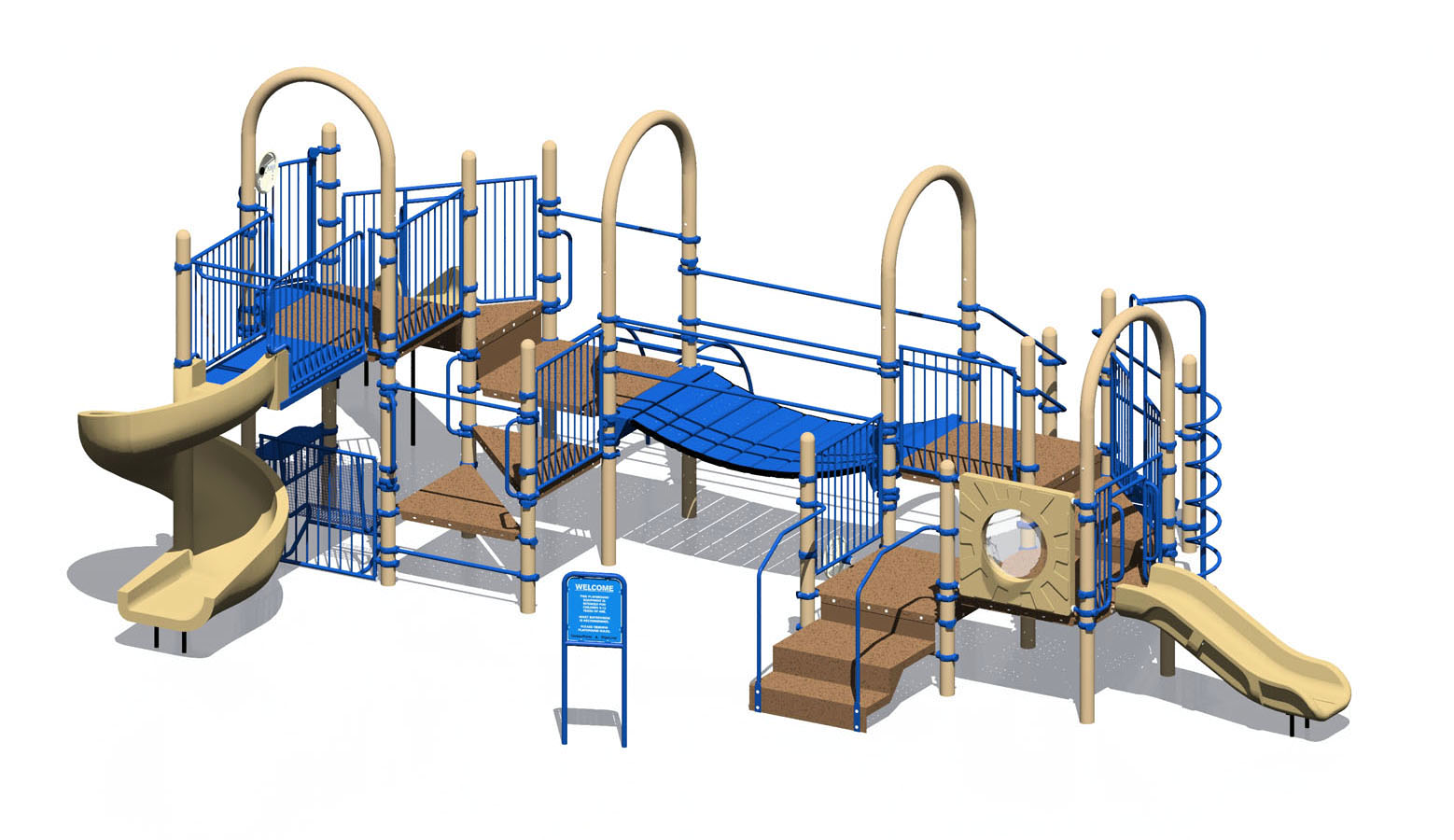 PipeLine 9886 Features/Activities: Play Area, Equipment Only: 35' x 22' (10.7m x 6.8m) Minimum Safe Use Zone: 47' x 34' (14.4m x 10.4m) 9886 Features: Accessible Transfer Station 8" (21cm) Riser, Arch Climber, Baluster Wall (3), Baluster Wall with Ship's Wheel, Bubble Panel, Coil Climber, Decorative Arch (4), Steel Grade Climber with Handrails, Kid's Bench, Lookout Platform with Ship's Wheel, Spiral Slide Chute, Storefront Countertop, Perforated Steel Suspension Bridge with Handrails, Talk Tube, Curved Tot Slide Chute, Wave Chute, Welcome/Rules Sign Colors Illustrated: Posts: Coffee Tan Accessories: Regal Blue Decks: SofDek Plastic-coated Perforated Steel, Brown Plastic: Tan Accessibility Profile: 13 Total Play Components 10 Elevated Play Components (6 Accessible) 3 Ground Level Play Components (3 Accessible) Downloads: View or Download: |